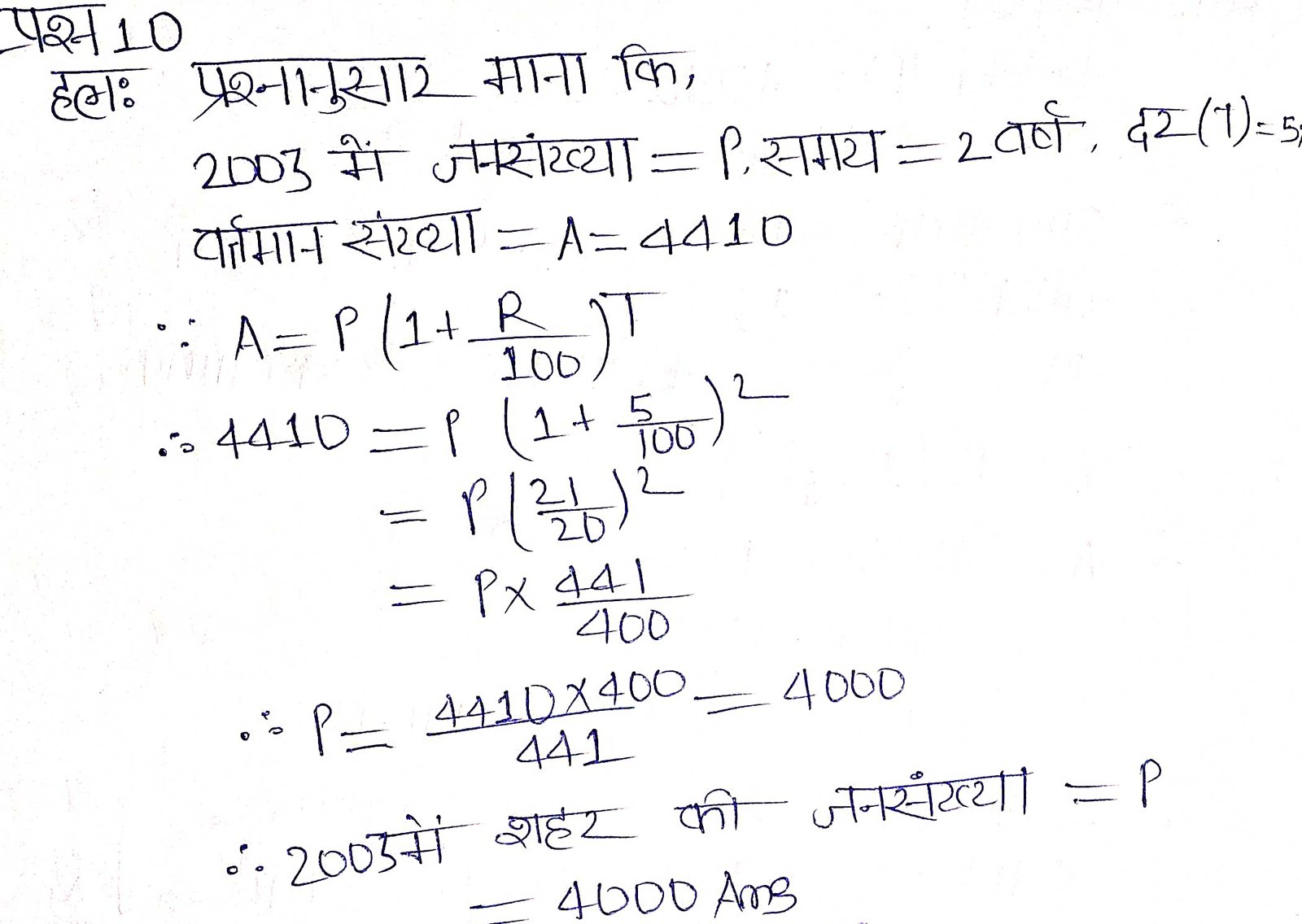प्रश्न 10. 5 प्रतिशत वार्षिक दर से बढ़ते हुए वर्ष 2005 के अंत में एक शहर की जनसंख्या 44.10 हो गई। बताइए वर्ष 2003 में इस शहर की जनसंख्या कितनी थी?