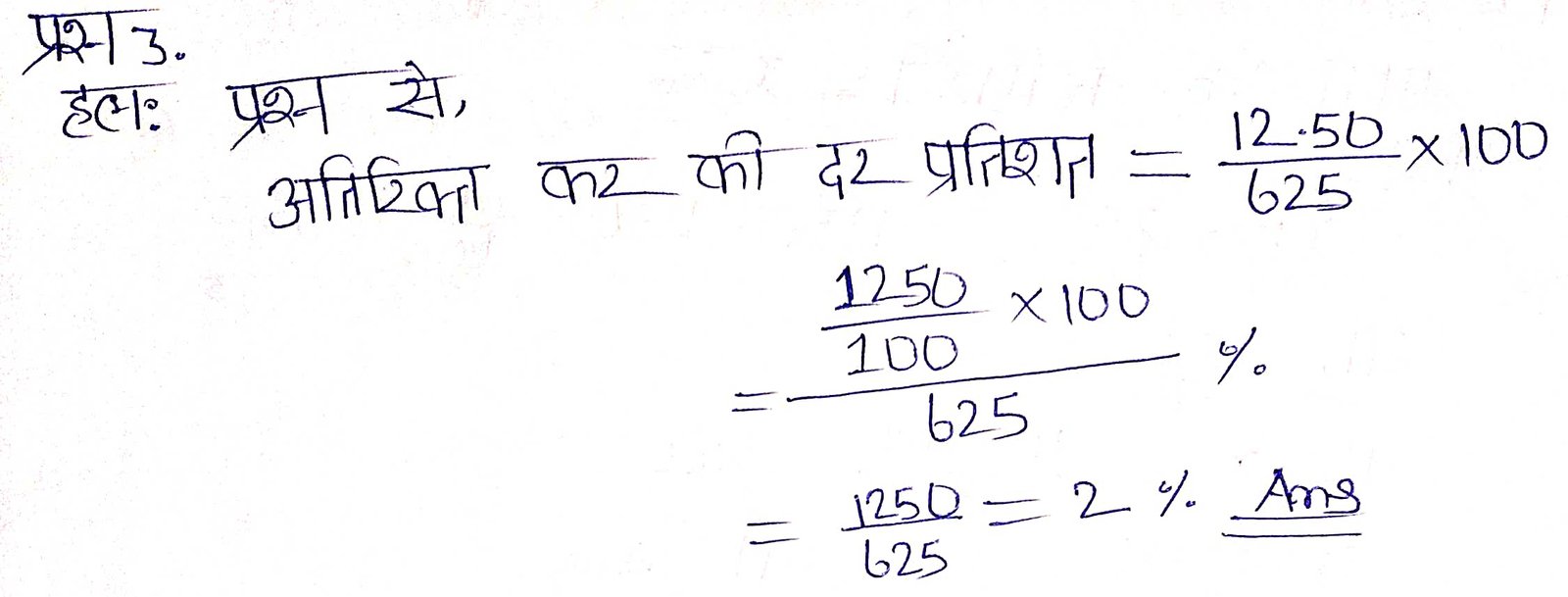 प्रश्न 3. रजिया ने एक दवा विक्रेता के यहाँ से 625 रु. अंकित मूल्य की दवाई खरीदी और उस पर 12 रु. 50 पैसे अतिरिक्त कर दिया। बताइए कि अतिरिक्त कर की दर प्रतिशत क्या थी?
