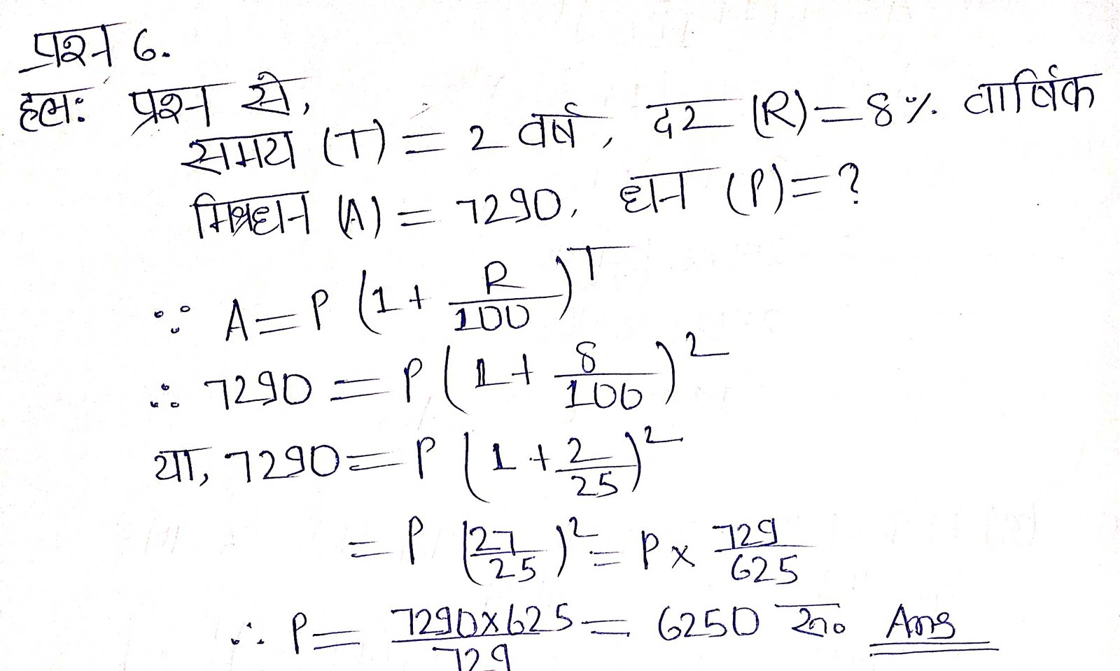 प्रश्न 6. वह धन ज्ञात कीजिए जो 8 प्रतिशत वार्षिक ब्याज की दर से 2 वर्ष में 7290 रु. हो जाता है।