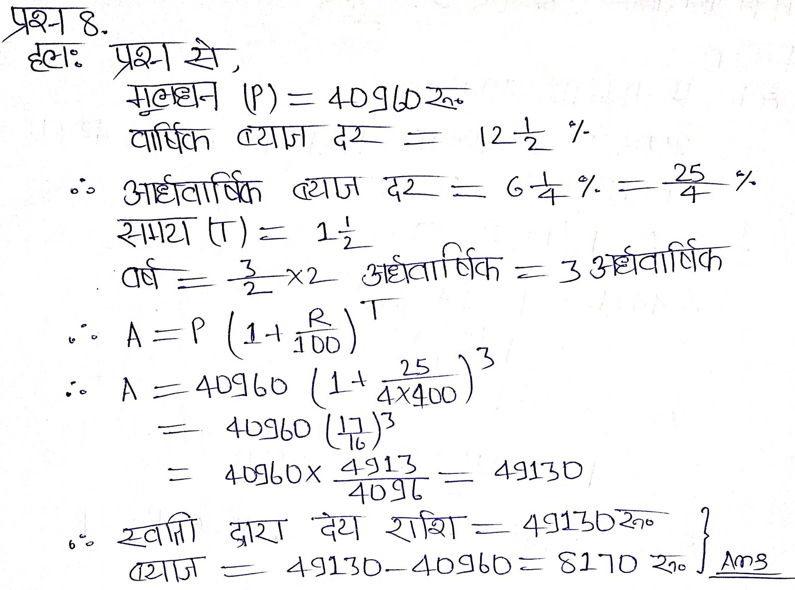 प्रश्न 8. स्वाति एक जमीन का टुकड़ा खरीदने हेतु बैंक से 40960 रु. कर्ज 12½% वार्षिक दर 1½ वर्ष के लिए कर्ज देती है और ब्याज का संयोजन अर्द्धवार्षिक होता है तो स्वाति को कितनी राशि देनी पड़ेगी और उनके द्वारा भुगतान किया गया ब्याज की राशि भी ज्ञात कीजिए।