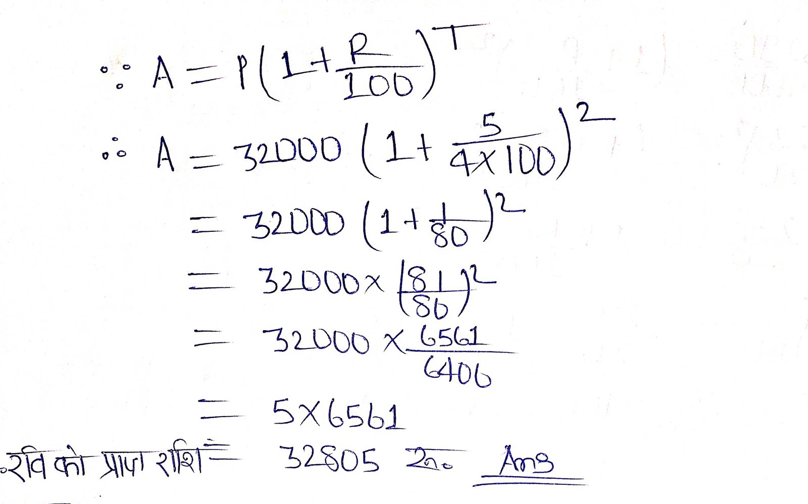 प्रश्न 9. रवि ने 32,000 रु. बैंक में जमा किया। उस बैंक द्वारा जमा की गई राशि पर ब्याज के संयोजन तिमाही घोषित हो तो और ब्याज की दर से 5 प्रतिशत वार्षिक हो तो रवि को महीने बाद कितनी राशि प्राप्त होगी।