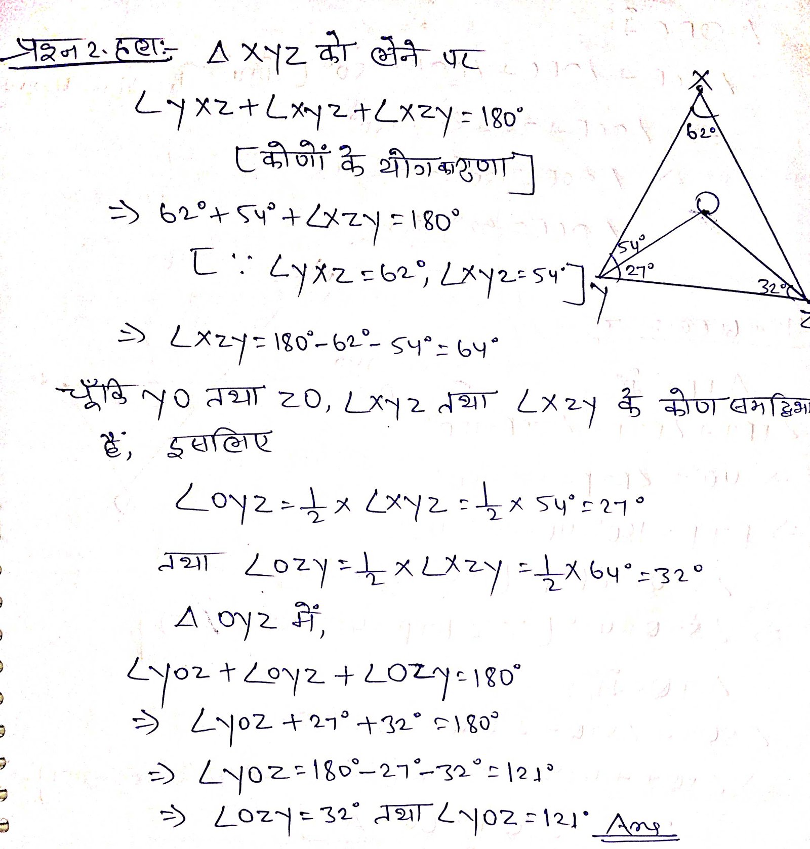 प्रश्न 2 आकृति में, ∠x = 62° और ∠XYZ = 54 है। यदि YO और ZO क्रमशः ∠XYZ. और ∠XYZ के सपद्विभाजक हैं, तो ∠OZY, ∠YOZ ज्ञात कीजिए।