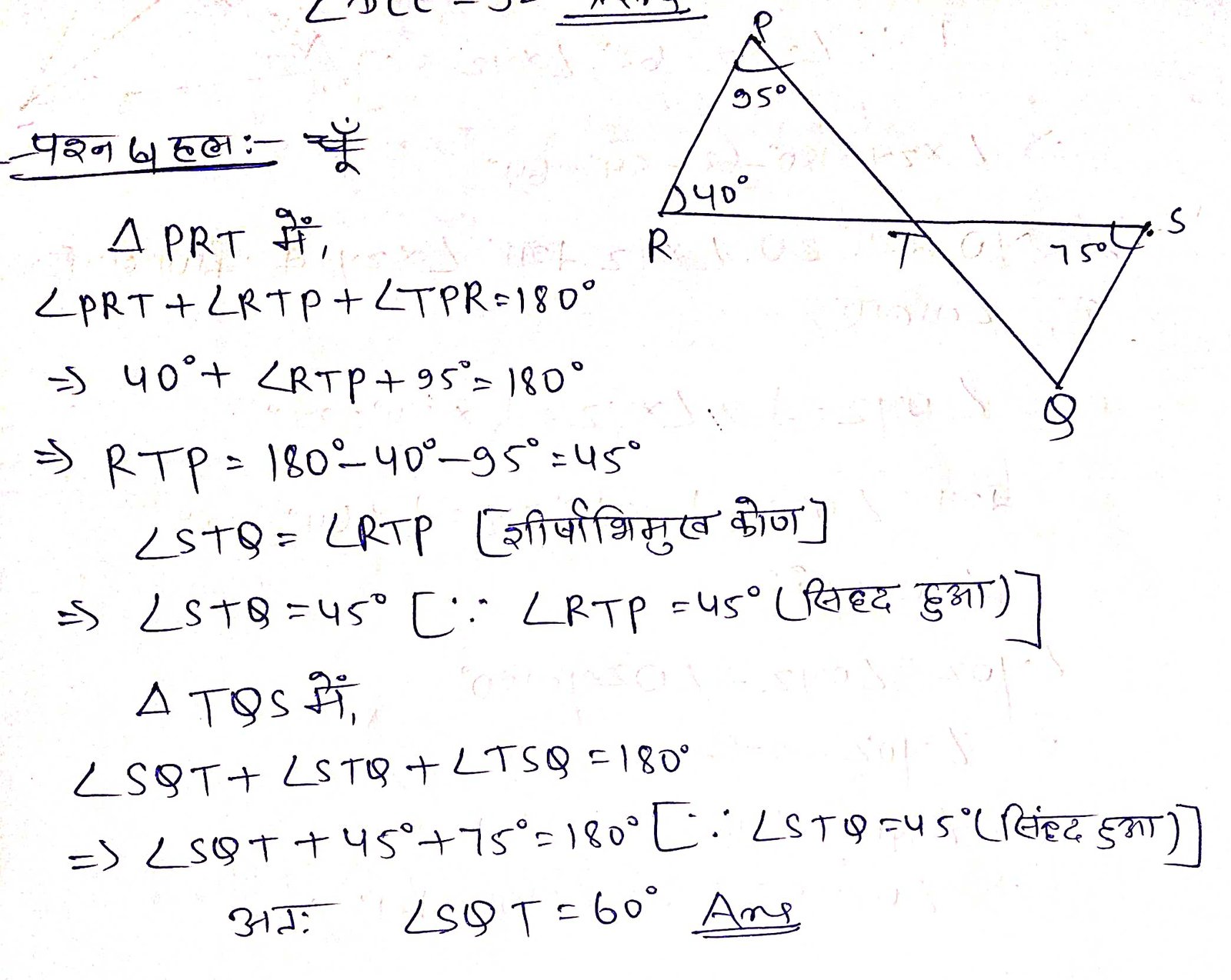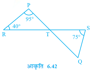 प्रश्न 4. आकृति में यदि रेखाएँ PQ और RS बिन्दु T पर इस प्रकार प्रतिच्छेद करती हैं कि ∠PRT = 40°, ∠RPT = 95° और ∠TSQ = 75° हैं, तो ∠SQT ज्ञात कीजिए।