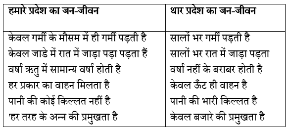 उत्तर— हमारे प्रदेश के जनजीवन और थार प्रदेश के जनजीवन में अंतरों की सूची निम्नलिखित है :
