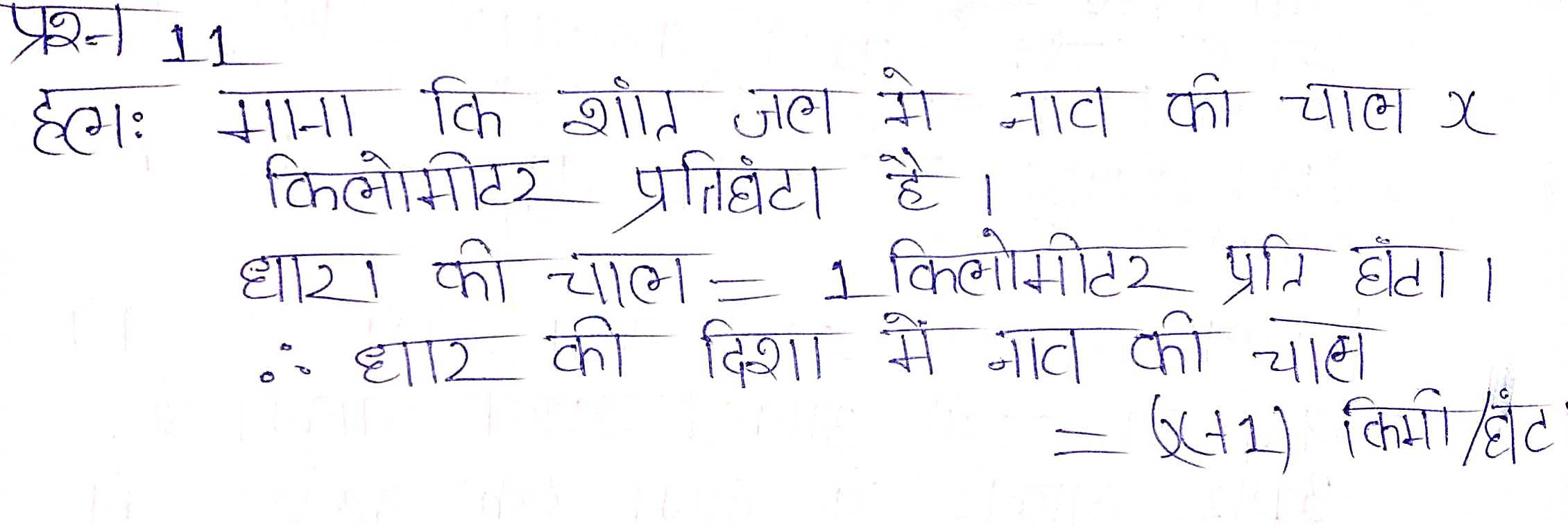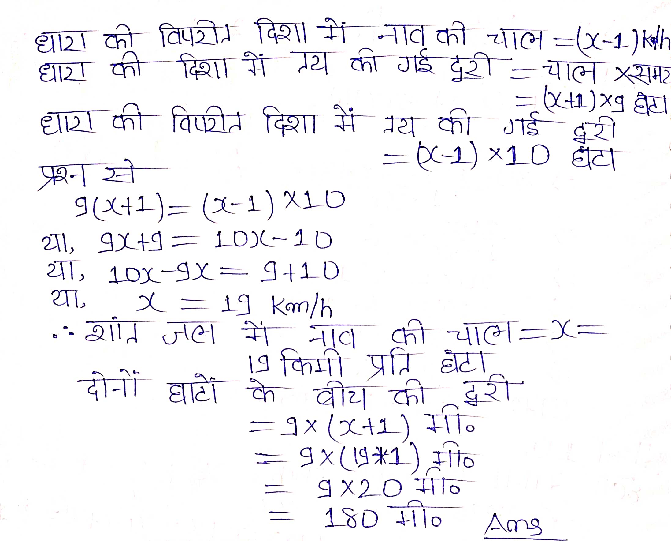 प्रश्न 11. एक नाव धारा की दिशा में एक घाट से दूसरे घाट तक जाने में 9 घंटे लगाती है । धारा की विपरीत दिशा में यही दूरी 10 घंटे में पूरा करती है। यदि धारा की चाल 1 किमी./प्रति घंटा हो तो शांत जल में नाव की चाल एवं दोनों घाटों के बीच की दूरी ज्ञात कीजिए।