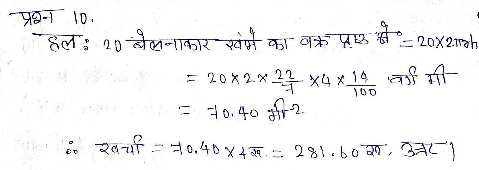 प्रश्न 10. एक भवन में 20 बेलनाकार खंभे लगे हैं जिसकी ऊँचाई 4 मीटर है तथा त्रिज्या 14 सेमी. है। 4 रुपये प्रति वर्गमीटर की दर से वक्रपृष्ठीय क्षेत्रफल में रँगाई करने का खर्च ज्ञात कीजिए।