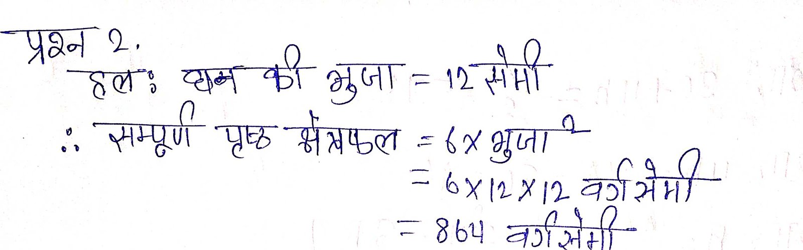 प्रश्न 2. एक घन की एक भुजा 12 सेन्टीमीटर है तो धन का सम्पूर्ण. पृष्ठ क्षेत्रफल ज्ञात कीजिए।