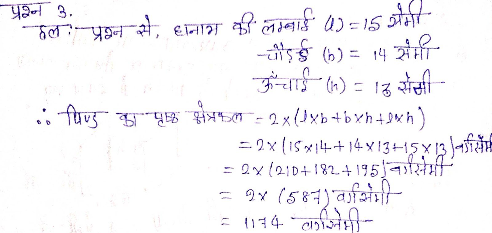 प्रश्न 3. एक धनाभाकार पिंड की लम्बाई 15 सेमी., चौड़ाई 14 सेमी. एवं ऊँचाई 13 सेमी. है, पिंड का पृष्ठ क्षेत्रफल ज्ञात कीजिए।