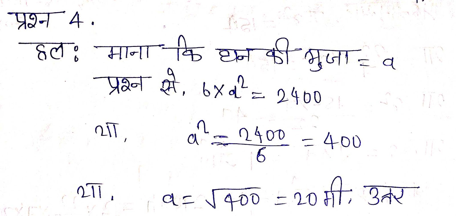 प्रश्न 4. ऐसे घनाभाकार पिंड की भुजा ज्ञात कीजिए जिसका पृष्ठीय क्षेत्रफल 2400 वर्ग मीटर है।