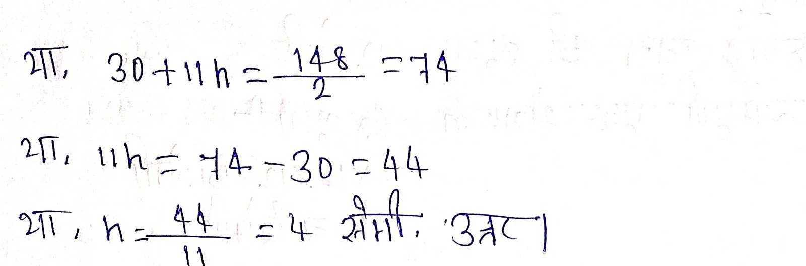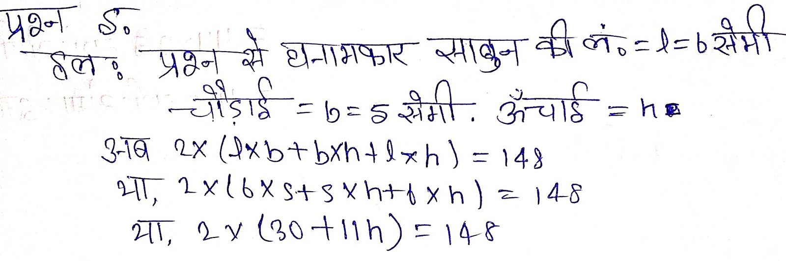प्रश्न 5. एक घनाभाकार साबुन की लम्बाई 6 सेमी., चौड़ाई 5 सेमी. एवं सम्पूर्ण पृष्ठ का क्षेत्रफल 148 वर्ग सेमी. है तो उसकी ऊँचाई ज्ञात कीजिए।