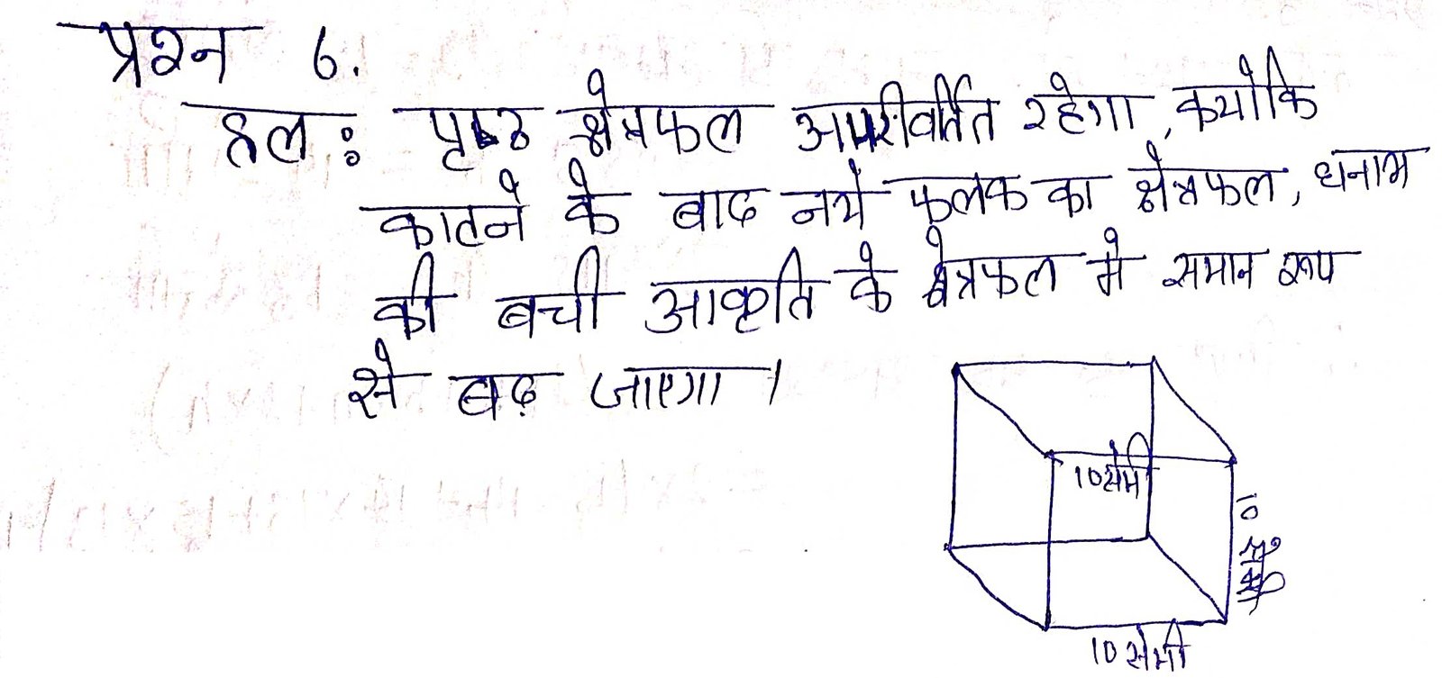प्रश्न 6. एक घनाकार लकड़ी के टुकड़े की एक किनारे की लम्बाई 10 सेमी. है। उसमें से 3 सेमी. × 2 सेमी. × 1 सेमी. आकार का घनाभ एक कोने से काटकर निकाल दिया गया तो शेष क्षेत्रफल कितना होगा?