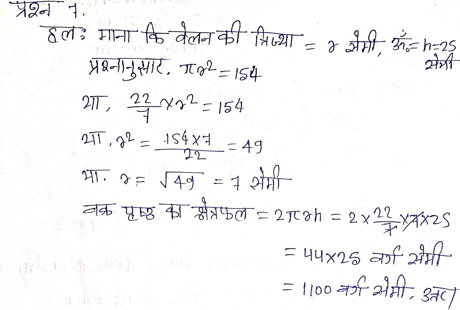 प्रश्न 7. एक बेलन की ऊँचाई 25 सेमी. है और आधार का क्षेत्रफल 154 वर्ग सेमी. है तो बेलन के वक्रपृष्ठ का क्षेत्रफल ज्ञात करें।