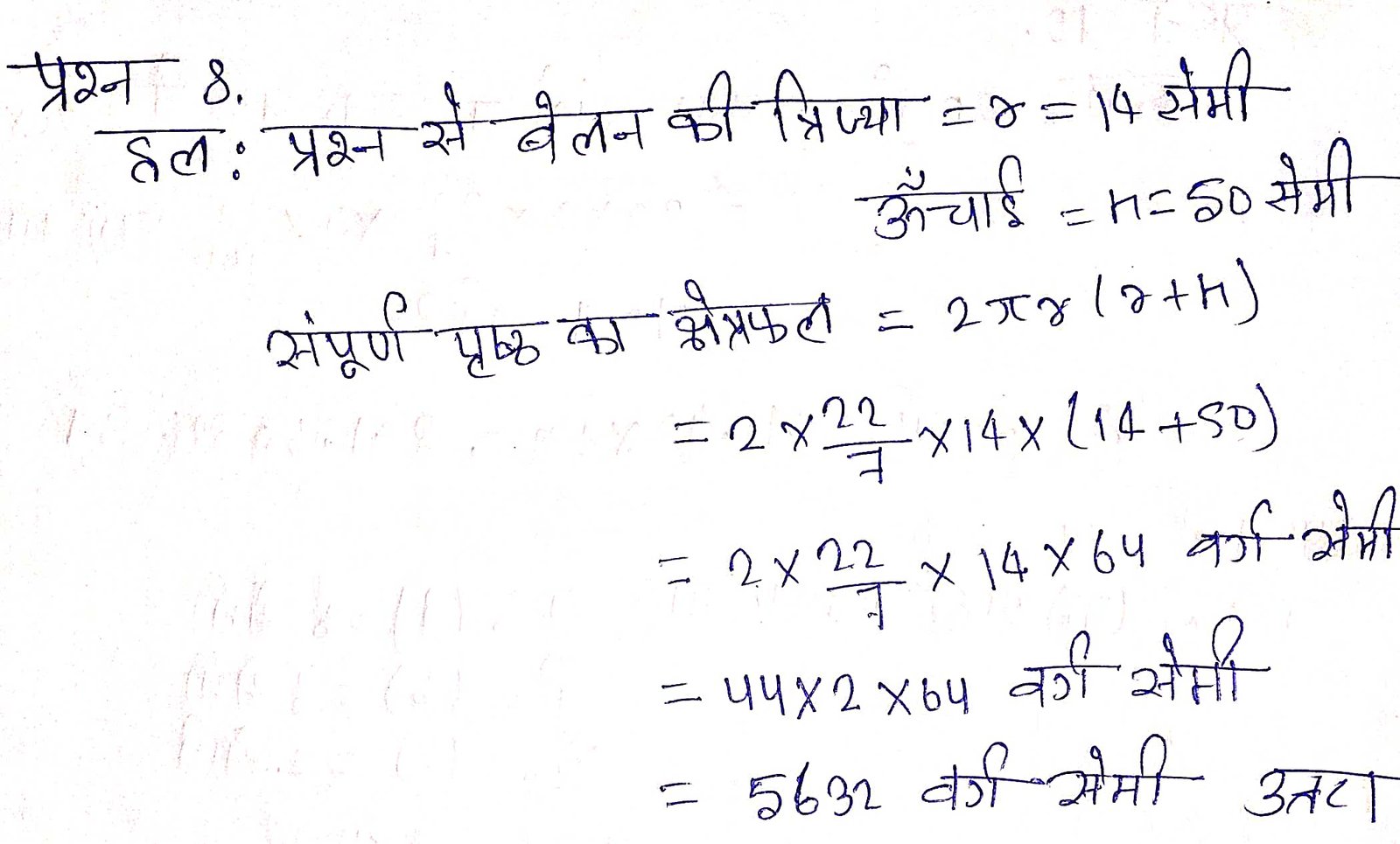 प्रश्न 8. एक बेलनाकार लकड़ी की लम्बाई 50 सेमी. है तथा आधार की त्रिज्या 14 सेमी. है। इसके सम्पूर्ण पृष्ठ का क्षेत्रफल ज्ञात करें।
