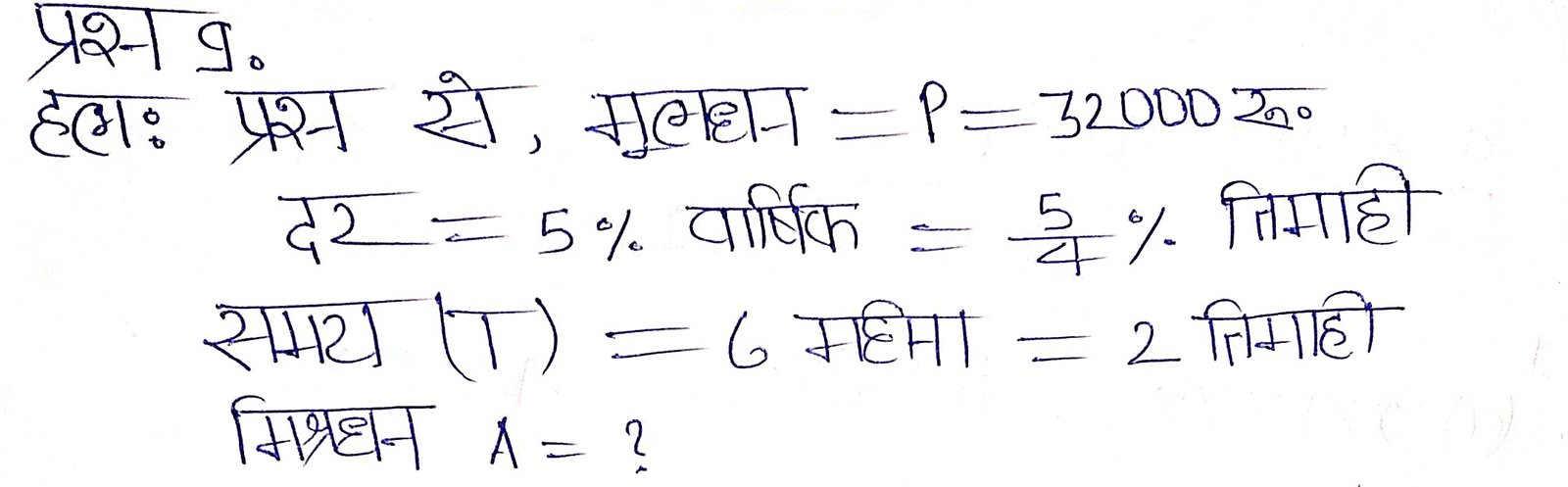 प्रश्न 9. रवि ने 32,000 रु. बैंक में जमा किया। उस बैंक द्वारा जमा की गई राशि पर ब्याज के संयोजन तिमाही घोषित हो तो और ब्याज की दर से 5 प्रतिशत वार्षिक हो तो रवि को महीने बाद कितनी राशि प्राप्त होगी।