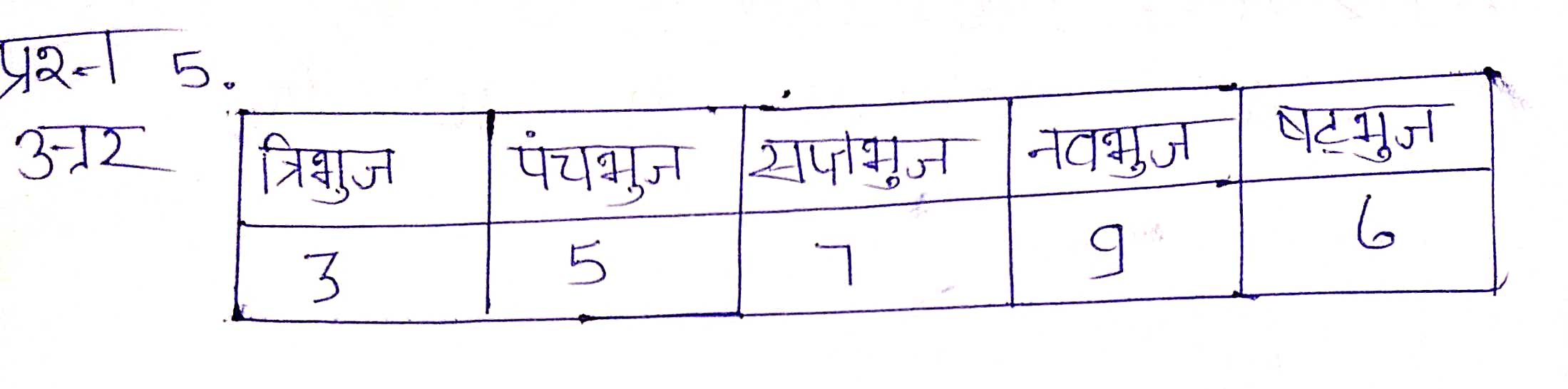 प्रश्न 5. नीचे के दो कॉलम में से एक में बहुभुज का नाम तथा दूसरे में उसकी भुजाओं की संख्याएँ दी गई हैं, बहुभुज के नाम को उनकी भुजाओं की संख्या से मिलान कीजिए।