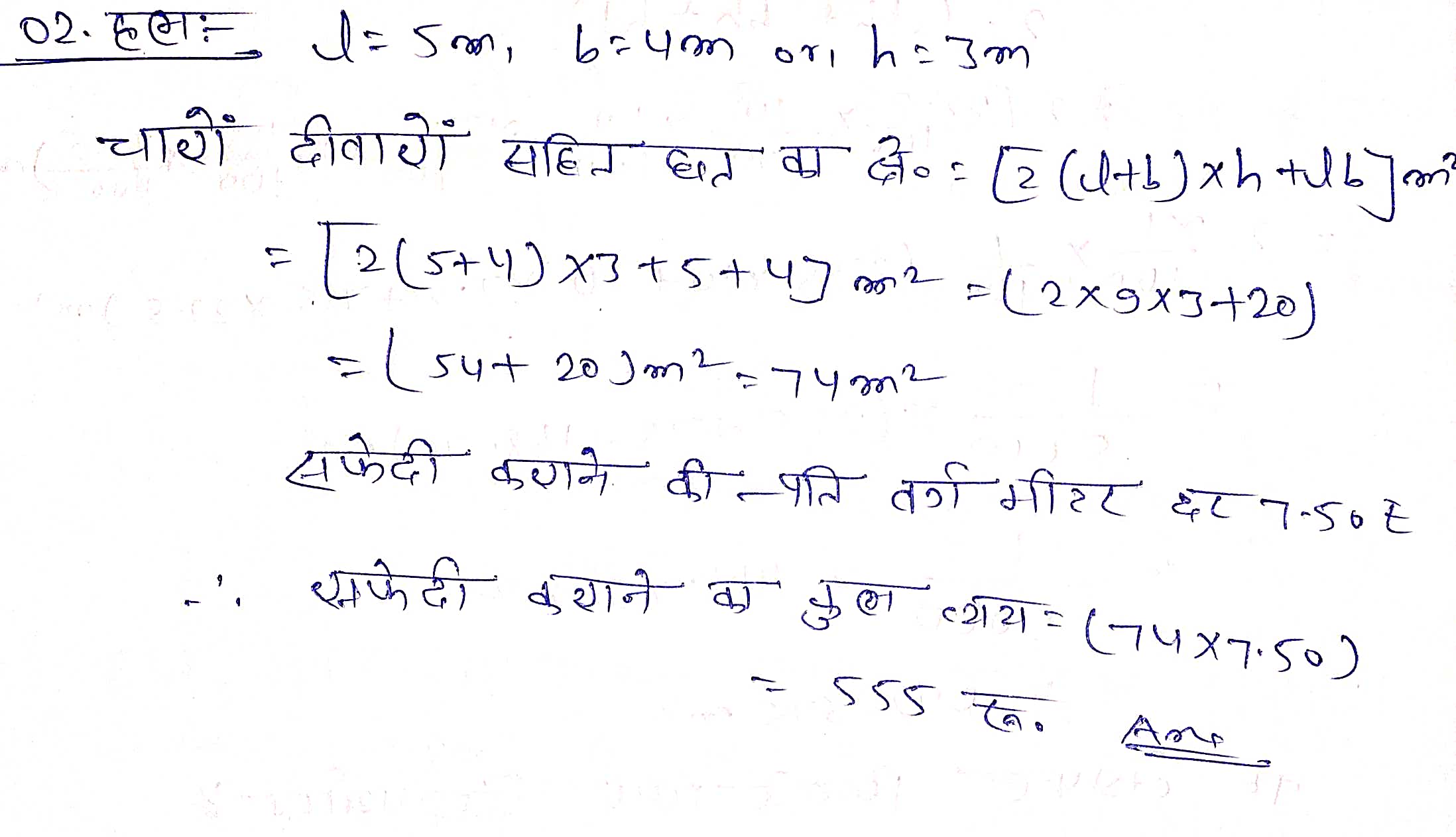 प्रश्न 2. एक कमरे की लम्बाई, चौड़ाई और ऊंचाई कमश: 5 m, 4 m और 3 m हैं। Rs 7.50 प्रतिmकी दर से इस कमरे की दीवारों और छत पर सफेदी कराने का व्यय जात कीजिए।