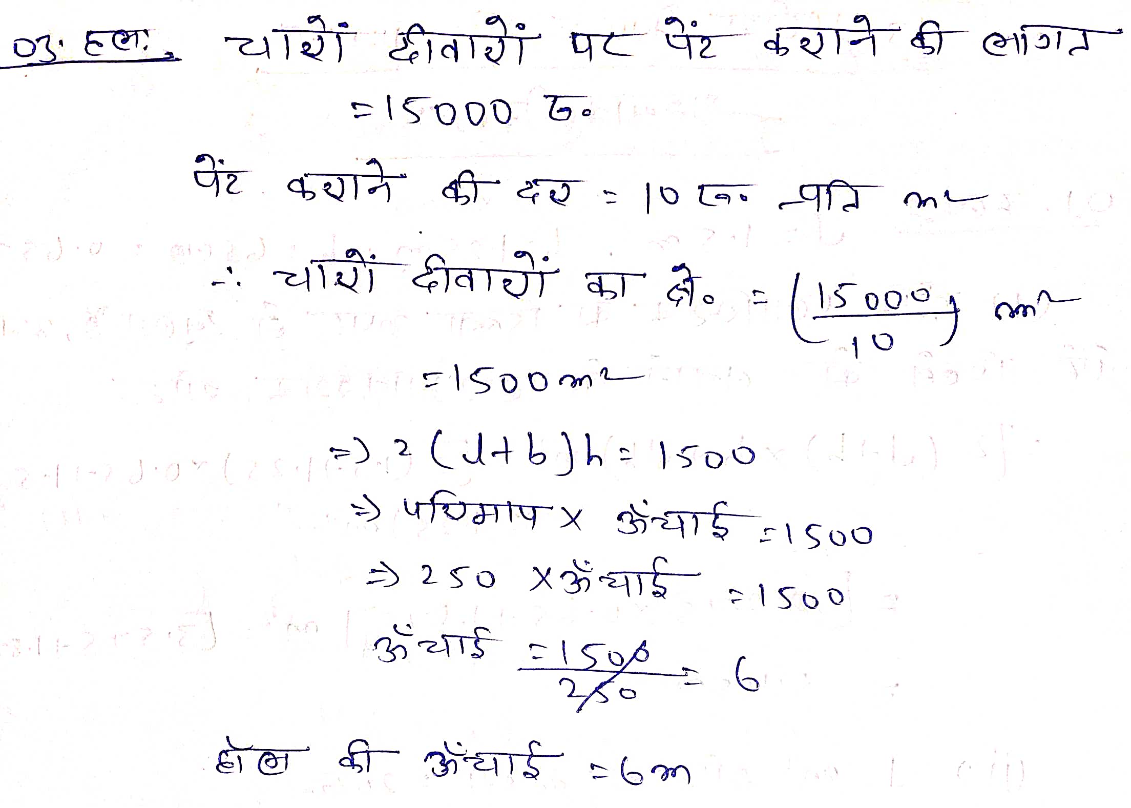 प्रश्न 3. किसी आयताकार हॉल के फर्श का परिमाप 250 m है। यदि Rs 10 प्रति m² की दर से चारों दीवारों पर पेर कराने की लागत Rs 15,000 है, तो इस हॉल की ऊँचाई ज्ञात कीजिए।