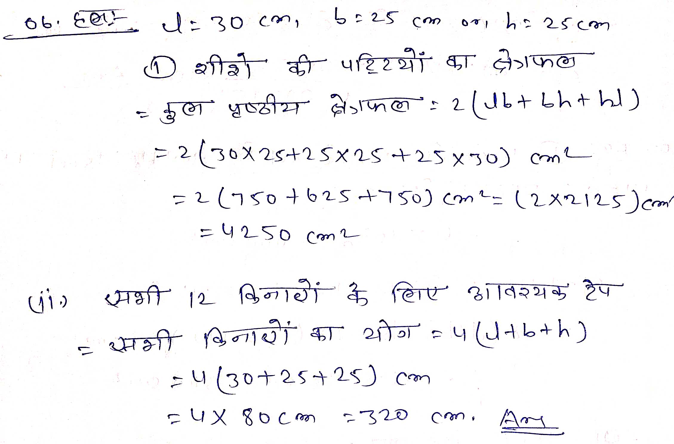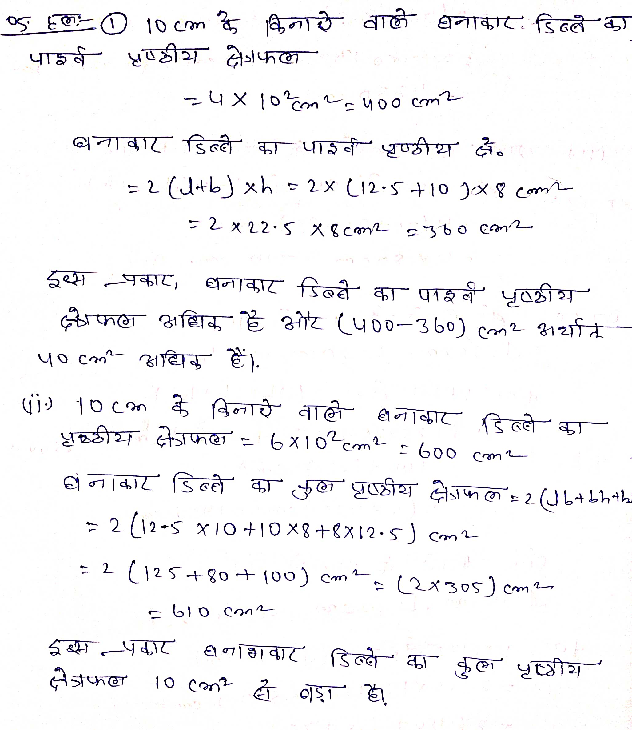 प्रश्न 7. शान्ति स्वीट स्टाल अपनी मिठाइयों को पैक करने के लिए गले के डिणे बनाने का ऑर्डर दे रहा था। दो मापों के डिब्बों की आवश्यकता थी। बडे डिब्बों की माप 25 cm × 20 cm × 5 cm श्री और छोटे मियों को माप 15 cm × 12 cm × 5 cm बीं। सभी प्रकार की अनिव्यापिकता (overlaps) के लिए कुल पृष्ठीय क्षेत्रफल के 5% के बराबर अतिरिक्त गत्ता लगेगा। यदि गले की लागत Rs 4 प्रति 1000 cm². तो प्रत्येक प्रकार के 250 दिव्ये बनवाने की कितनी लागत आएगी?