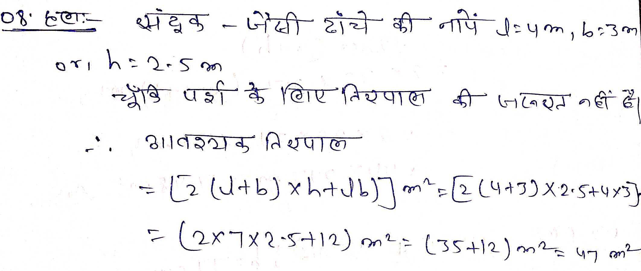 प्रश्न 8. परवीन अपनी कार खड़ी करने के लिए, एक सन्दूक के प्रकार के डाँचे जैसा एक अस्थाई स्थान तिरपाल की महायता से बनाना चाहती है, जो कार को चारों ओर से और ऊपर से उकले (सामने वाला फलक लटका हुआ होगा जिसे घुमाकर ऊपर किया जा सकता है। यह मानते हुए कि सिलाई के समय लगा तिरपाल का अतिरिक्त कपड़ा नगण्य होगा, आधार विमाओं 4 मीटर × 3 मीटर और ऊंचाई 2.5 मीटर वाले इस बाँचे को बनाने के लिए कितने तिरपाल की। आवश्यकता होगी?