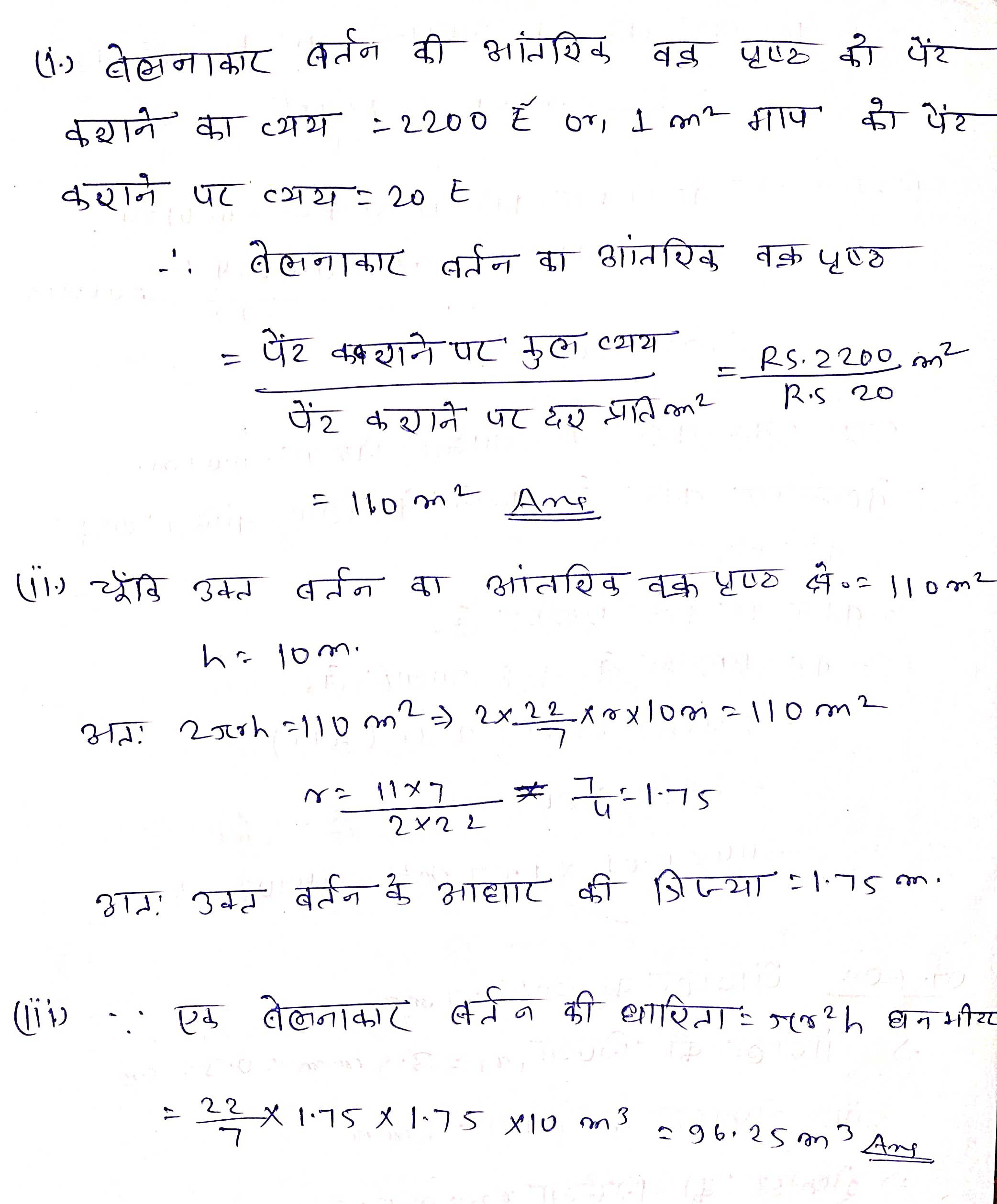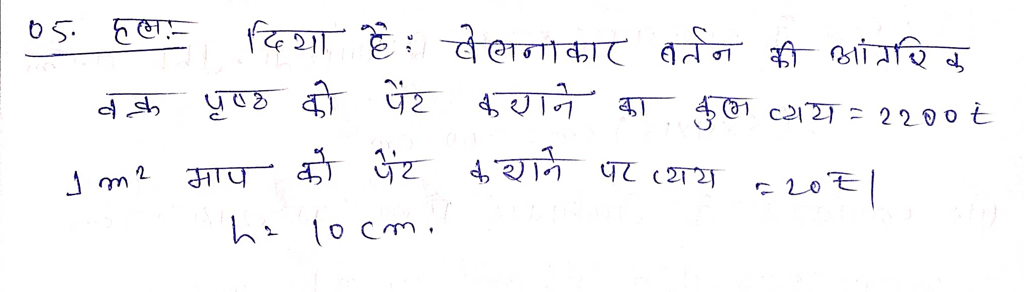 प्रश्न 5. 10 m गहरे एक बेलनाकार बर्तन की आंतरिक वक़ पृष्ठको पेंट कराने का व्यय Rs 2,200 है। यदि पेंट कराने की दर Rs 20 प्रति m² है, तो ज्ञात कीजिए