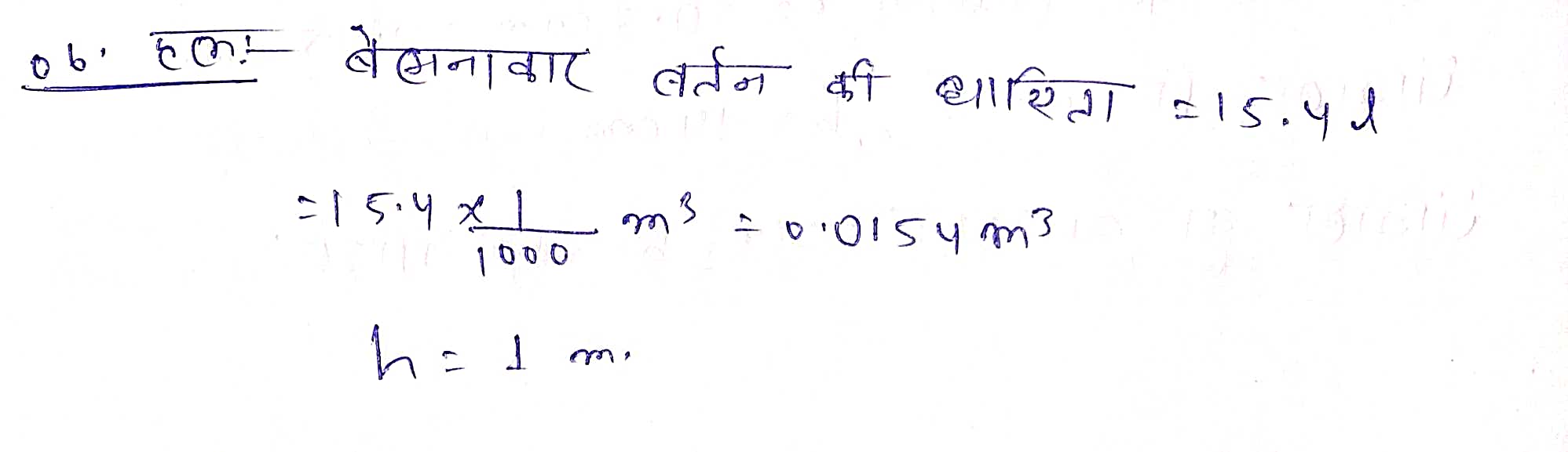 प्रश्न 6. ऊँचाई 1 m वाले एक बेलनाकार वर्तन की धारिता 15.4 लीटर है। इसको बनाने के लिए कितने वर्ग मीटर धातु की आवश्यकता होगी?