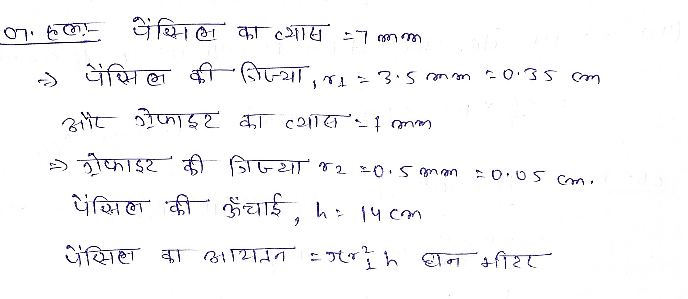 प्रश्न 7. सीसे की एक पेंसिल (lead pencil) लकड़ी के एक बेलन के अभ्यंतर ग्रेफाइट (graphite) से बने ठोस बेलन को डालकर बनाई गई है। पेंसिल का व्यास 7 mm है और बेफाइट का व्यास 1 mm है। यदि पसिल की लंबाई 14 cm है, तो लकड़ी का आयतन और ग्रेफाइट का आयतन जात कीजिए।