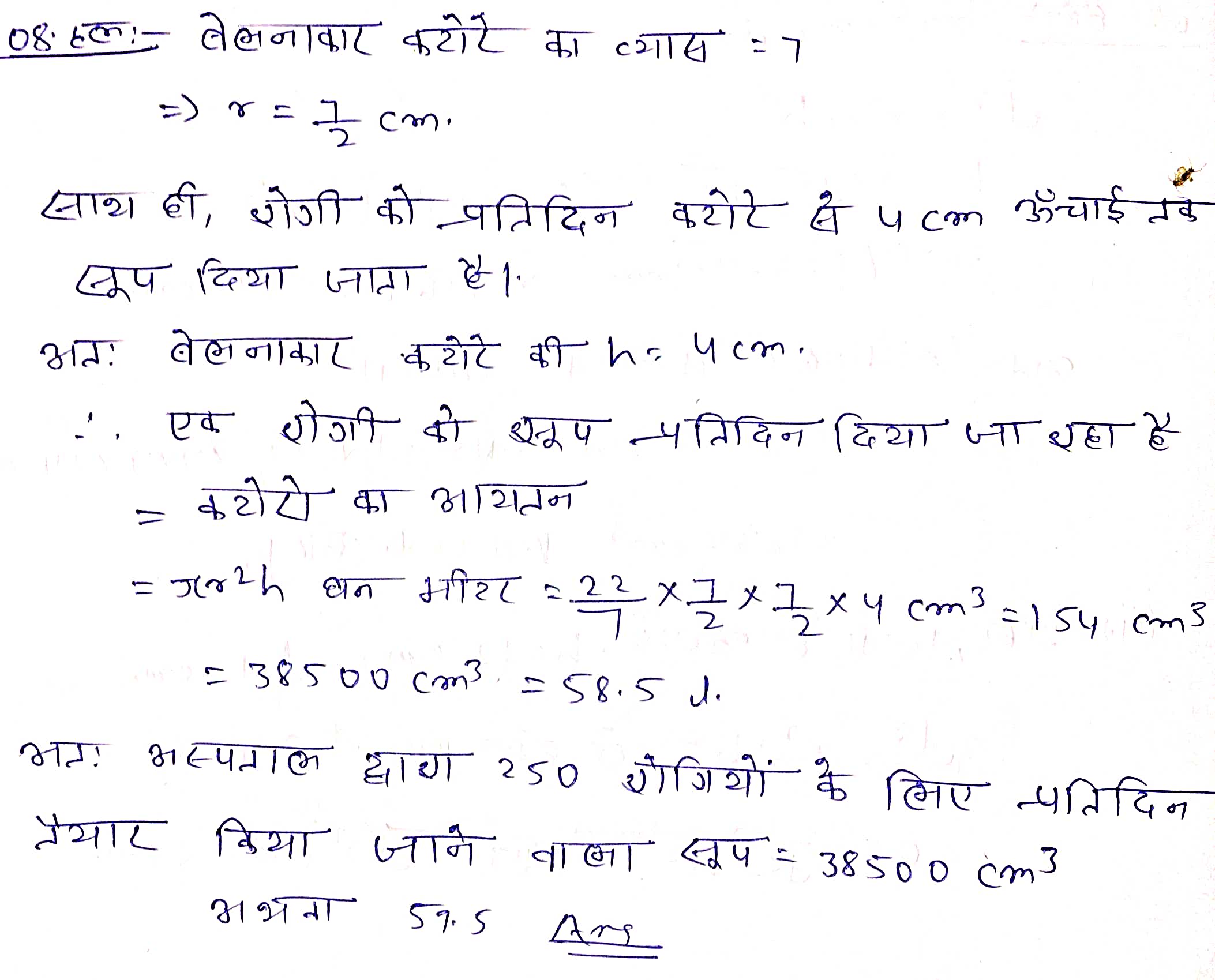 प्रश्न 8. एक अस्पताल (Hospital) के एक रोगी को प्रतिदिन 7 cm व्यास वाले एक बेलनाकार कटोरे में सूप (Soup) दिया जाता है। यदि एक कटोरा सूप से 4 cm ऊंचाई तक भरा जाता है, तो इस अस्पताल में 250 रोगियों के लिए प्रतिदिन कितना सूप तैयार किया जाता है?