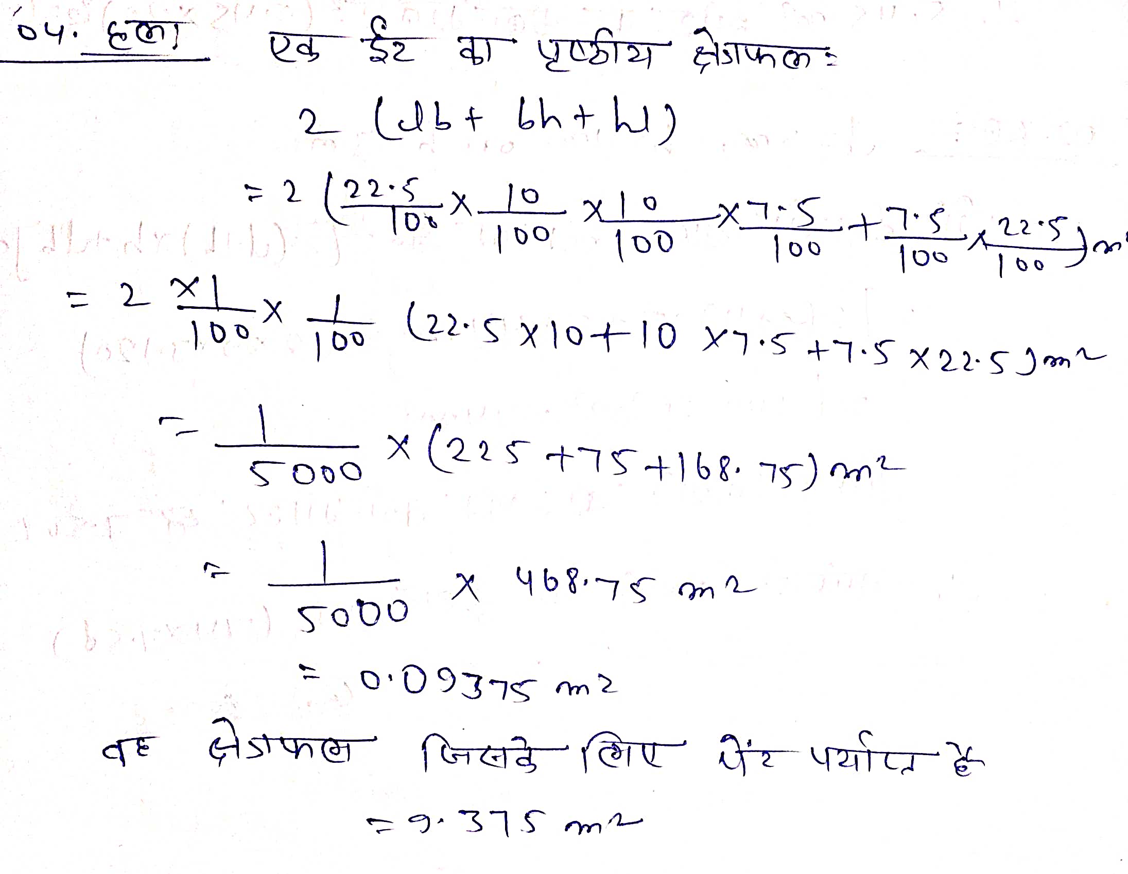 प्रश्न 4. किसी डिव्ये में भरा हुआ पेन्ट 9.375 m² के क्षेत्रफल पर पेंट करने के लिए पर्याप्त है। इस डिब्बे के पेंट से 22.5 cm × 10 cm × 7.5 cm विमाओं वाली कितनी इंट पेंट की जा सकती हैं?