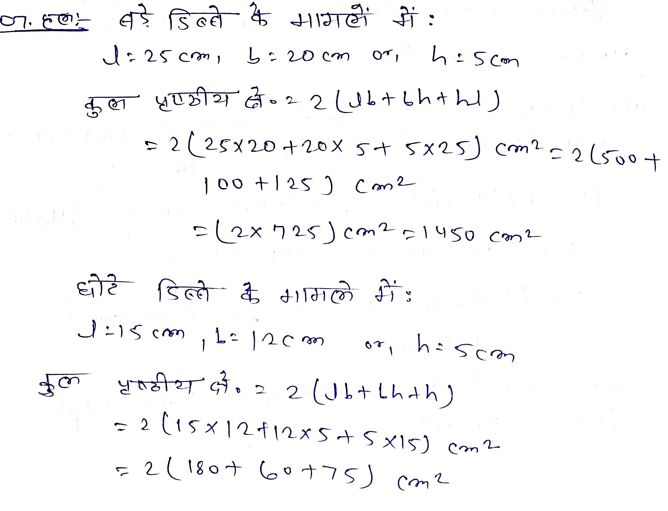 प्रश्न 7. शान्ति स्वीट स्टाल अपनी मिठाइयों को पैक करने के लिए गले के डिणे बनाने का ऑर्डर दे रहा था। दो मापों के डिब्बों की आवश्यकता थी। बडे डिब्बों की माप 25 cm × 20 cm × 5 cm श्री और छोटे मियों को माप 15 cm × 12 cm × 5 cm बीं। सभी प्रकार की अनिव्यापिकता (overlaps) के लिए कुल पृष्ठीय क्षेत्रफल के 5% के बराबर अतिरिक्त गत्ता लगेगा। यदि गले की लागत Rs 4 प्रति 1000 cm². तो प्रत्येक प्रकार के 250 दिव्ये बनवाने की कितनी लागत आएगी?