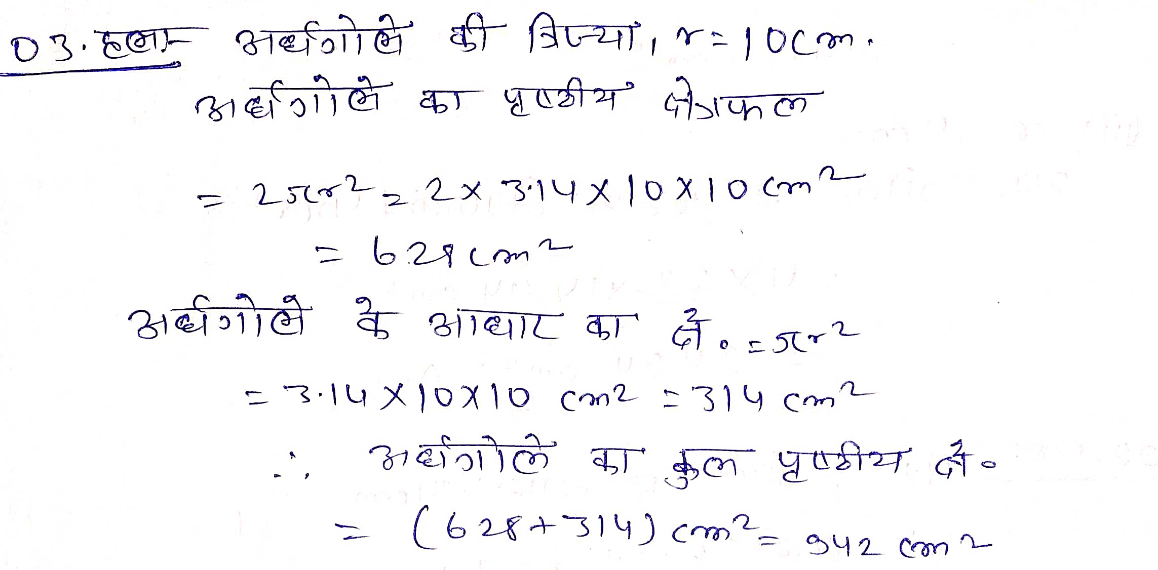 प्रश्न 3. 10 cm त्रिज्या वाले एक अर्धगोले का कुल पृष्ठीय क्षेत्रफल ज्ञात कीजिए। (π = 3.14 लीजिए।)