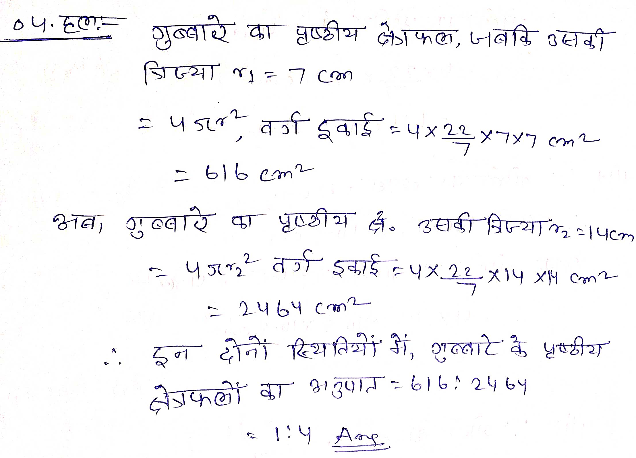 प्रश्न 4. एक गोलाकार गुब्बारे में हवा भरने पर, आकी त्रिज्या 7 cm से 14 cm हो जाती है। इन दोनों स्थितियों में, गुब्बारे के पृष्ठीय क्षेत्रफलों का अनुपात ज्ञात कीजिए।