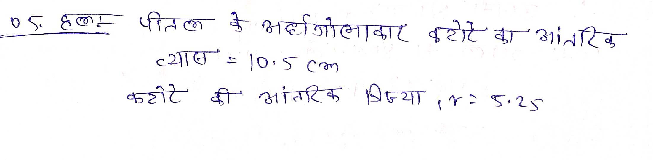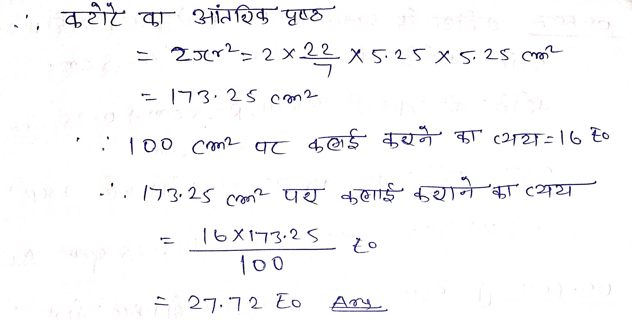 प्रश्न 5. पीतल से बने एक अर्धगोलाकार कटोरे का आंतरिक व्यास 10.5 cm है। Rs 16 प्रति 100 cm² की दर से इसके आंतरिक पृष्ठ पर कलई का ज्यब ज्ञात कीजिए।