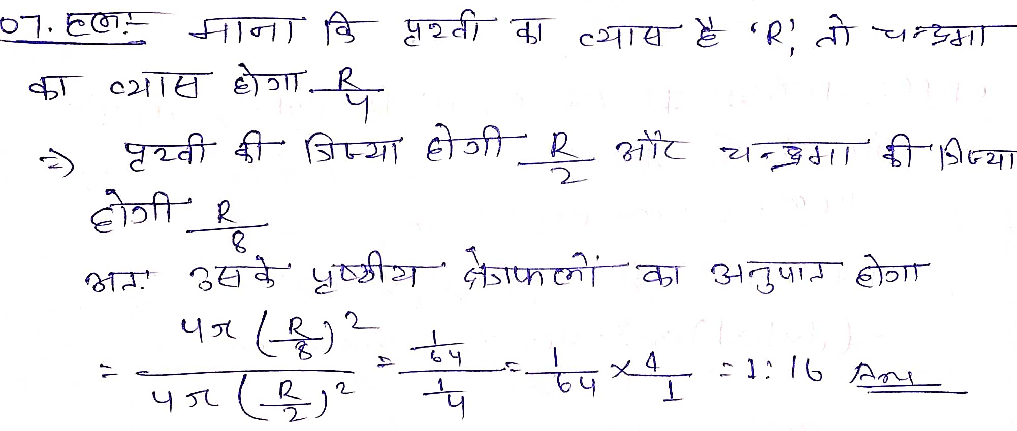 प्रश्न 7. चन्द्रमा का व्यास पृथ्वी के व्यास का लगभग एक-चौथाई है। इन दोनों के पृष्टीय क्षेत्रफलों का अनुपात ज्ञात कीजिए।
