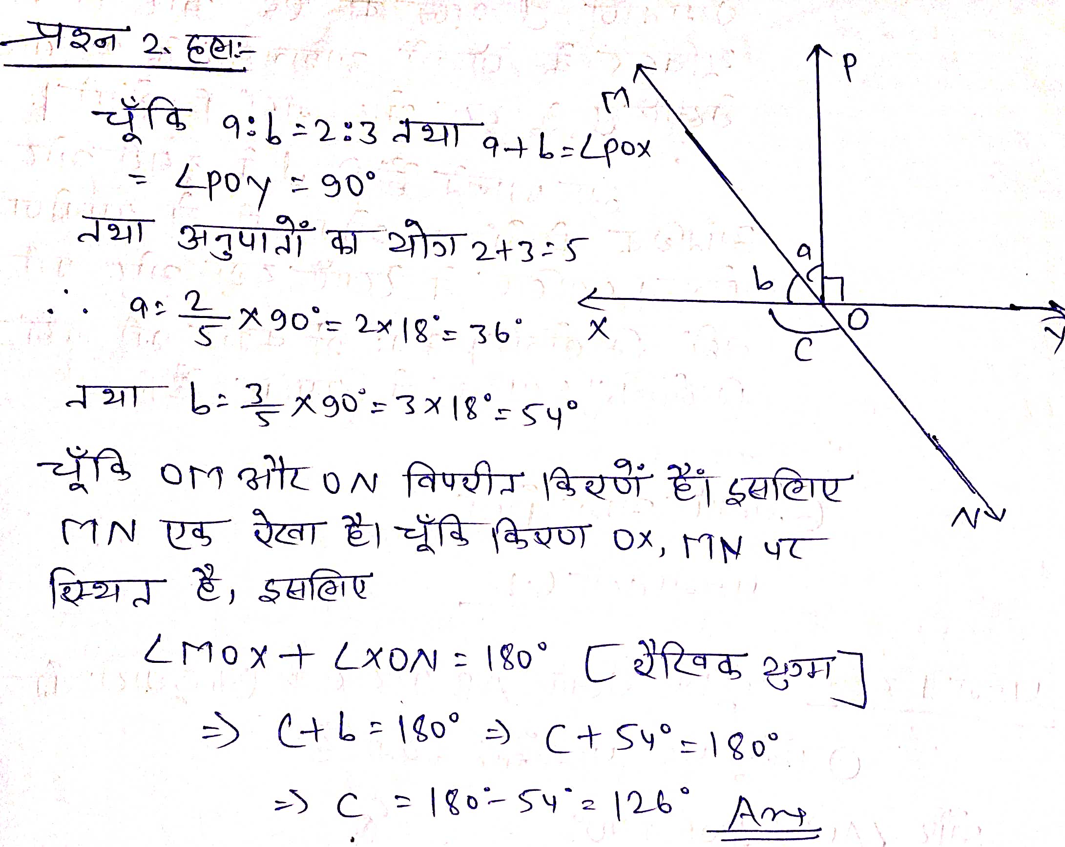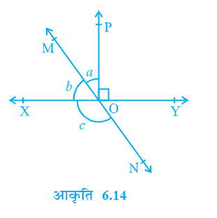 प्रश्न 2. आकृति 6.2 में रेखाएँ XY और MN बिन्दु O पर प्रतिच्छेद करती है। यदि ∠POY = 90° और a : b = 2 : 3 है, तो c ज्ञात कीजिए।