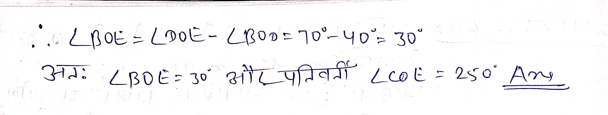 प्रश्न 1. आकृति 61 में रेखाएँ AB और CD बिन्दु O पर प्रतिच्छेद करती हैं। यदि ∠AOC + ∠BOE = 70° है और ∠BOD = 40° है, तो ∠BOE और प्रतिवर्ती ∠COE ज्ञात कीजिए।
