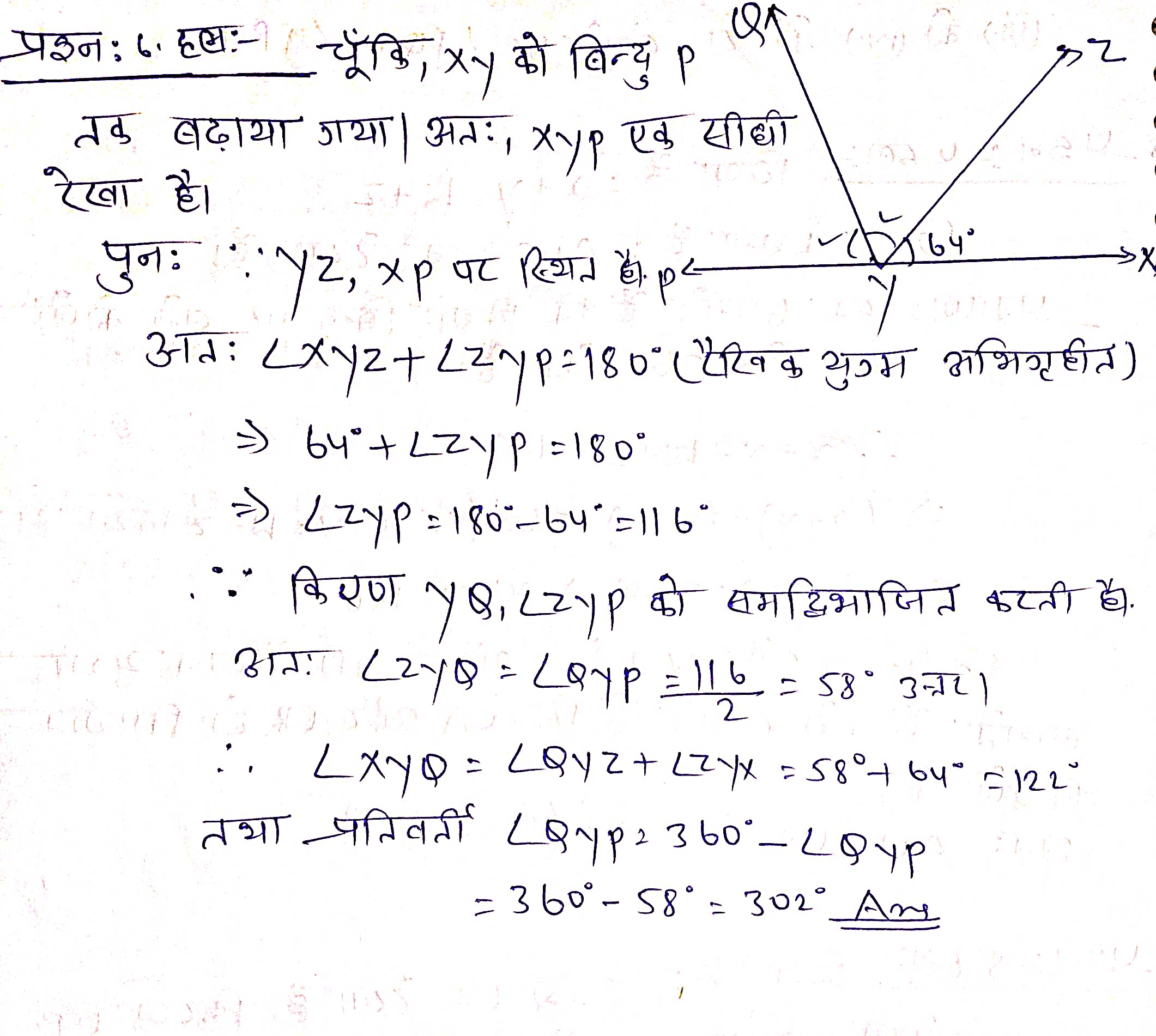 प्रश्न 6. यह दिया है कि ∠XYZ = 64° है और XY को बिन्दु P तक बढ़ाया गया है। दी हुई सूचना से एक आकृति खींचिए। यदि किरण YQ, ∠ZYP को समद्विभाजित करती है, तो ∠XYQ और प्रतिवर्ती ∠QYP के मान ज्ञात कीजिए।