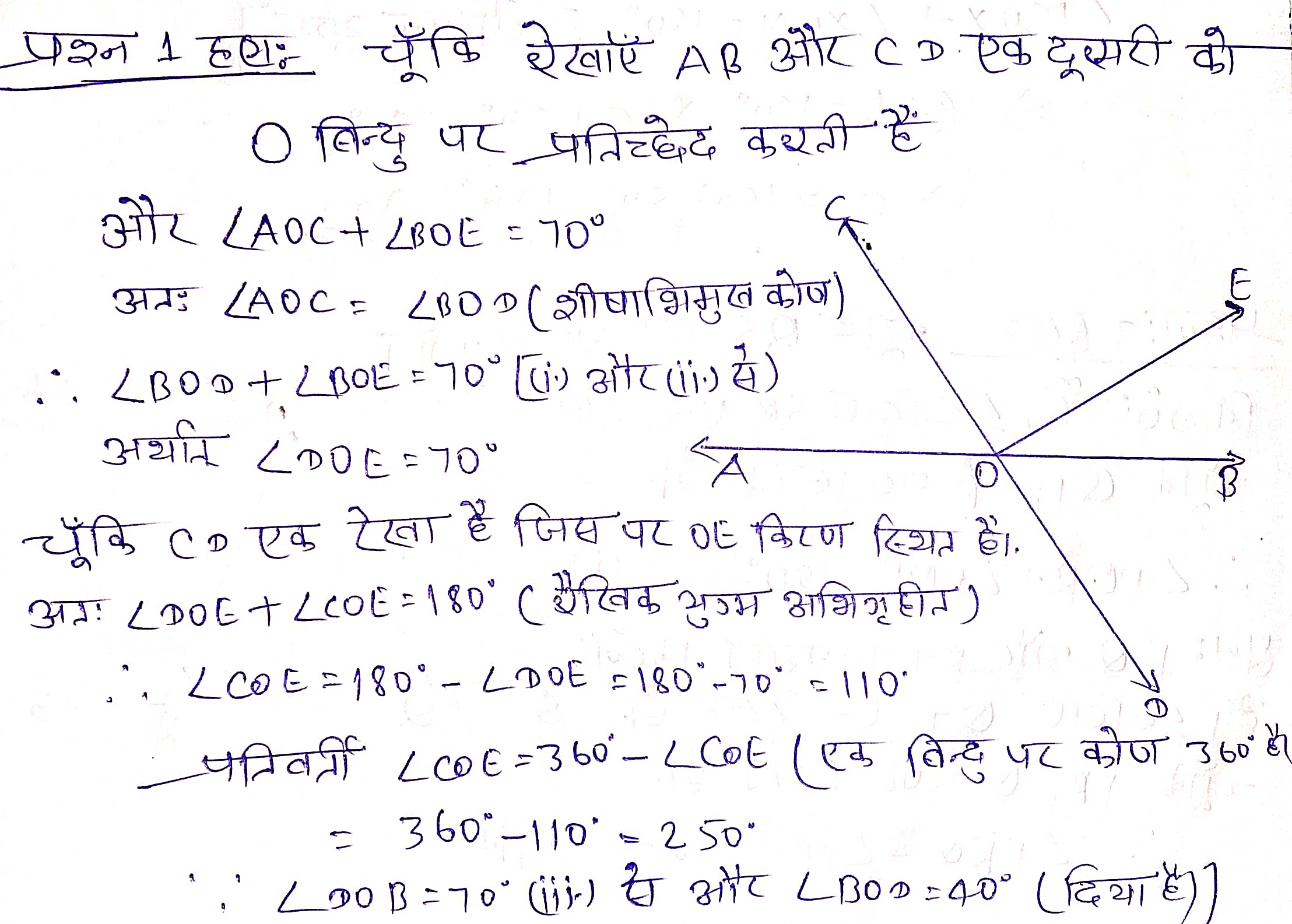 प्रश्न 1. आकृति 61 में रेखाएँ AB और CD बिन्दु O पर प्रतिच्छेद करती हैं। यदि ∠AOC + ∠BOE = 70° है और ∠BOD = 40° है, तो ∠BOE और प्रतिवर्ती ∠COE ज्ञात कीजिए।