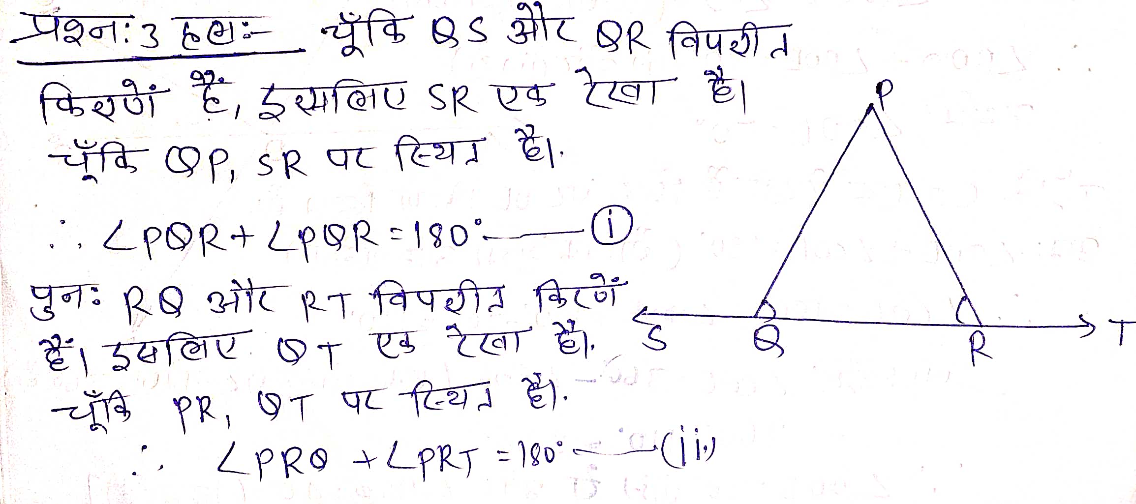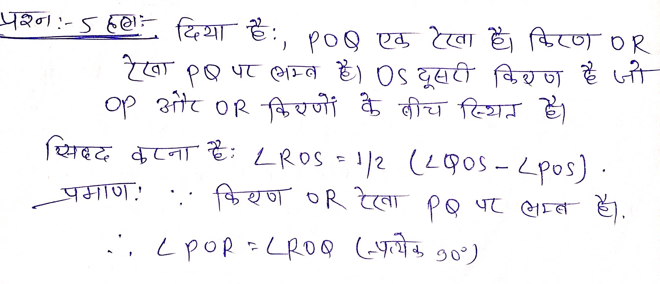 प्रश्न 5. आकृति में 6.5 में, POQ एक सरल रेखा है। किरण OR रेखा PQ पर लष्य है। किरणों OP और OR के बीच OS एक अन्य किरण आकृति है। सिद्ध कीजिए-
