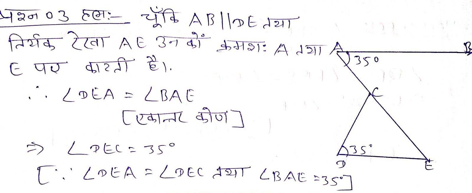 प्रश्न 3. आकृति में, यदि AB || DE ∠BAC = 35° और ∠CDE = 53° है, तो ∠DCE ज्ञात कीजिए।