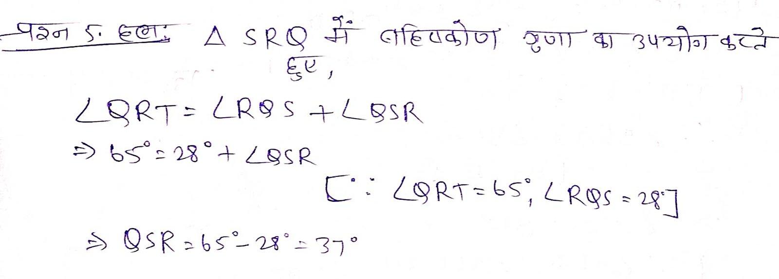प्रश्न 5. आकृति में, यदि PQ ⊥ PS. PQ || SR, ∠SQR = 28° और ∠QRT = 65° है, तो x और y का मान ज्ञात कीजिए।