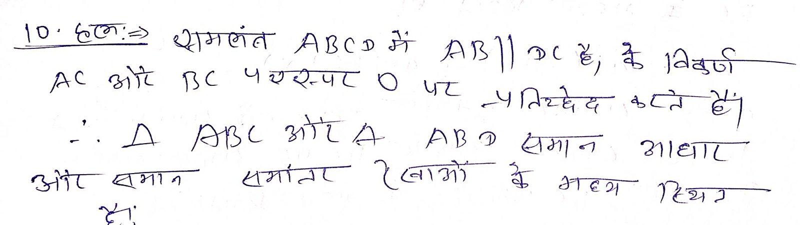 प्रश्न 10. एक समलम्ब ABCD, जिसमें AB || DC है. के विकर्ण AC और BD परस्पर O पर प्रतिच्छेद करते हैं। दर्शाइए कि ar (∆AOD) = ar (∆BOC) है।