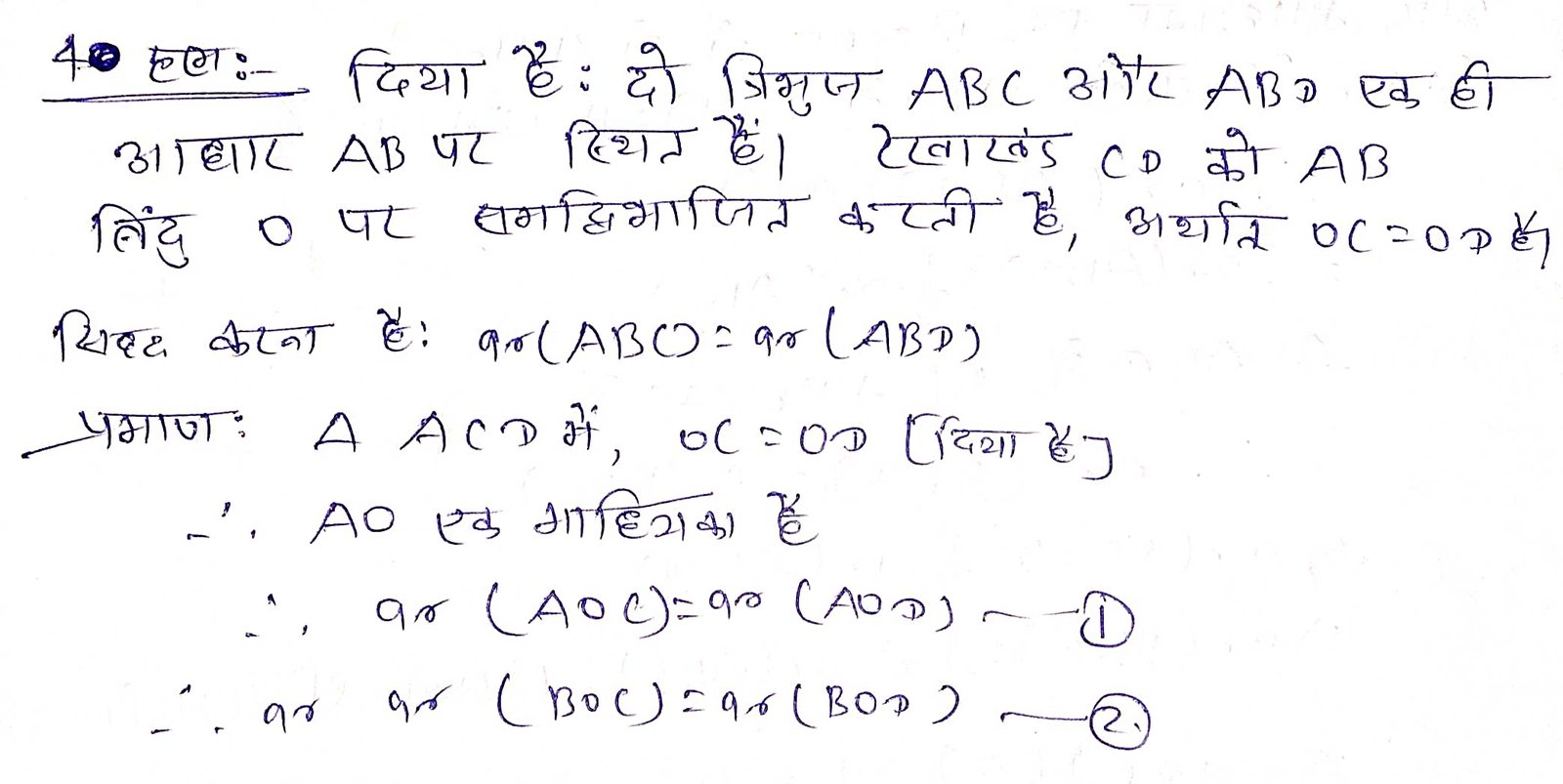 प्रश्न 4. आकृति में, ABC तथा ABD एक ही आधार AB पर बने दो त्रिभुज हैं। यदि रेखाखण्ड CD रेखाखण्ड AB बिन्दु O पर समद्वि भाजित होता है, तो दर्शाइए कि ar (ABC) = ar (ABD) है।