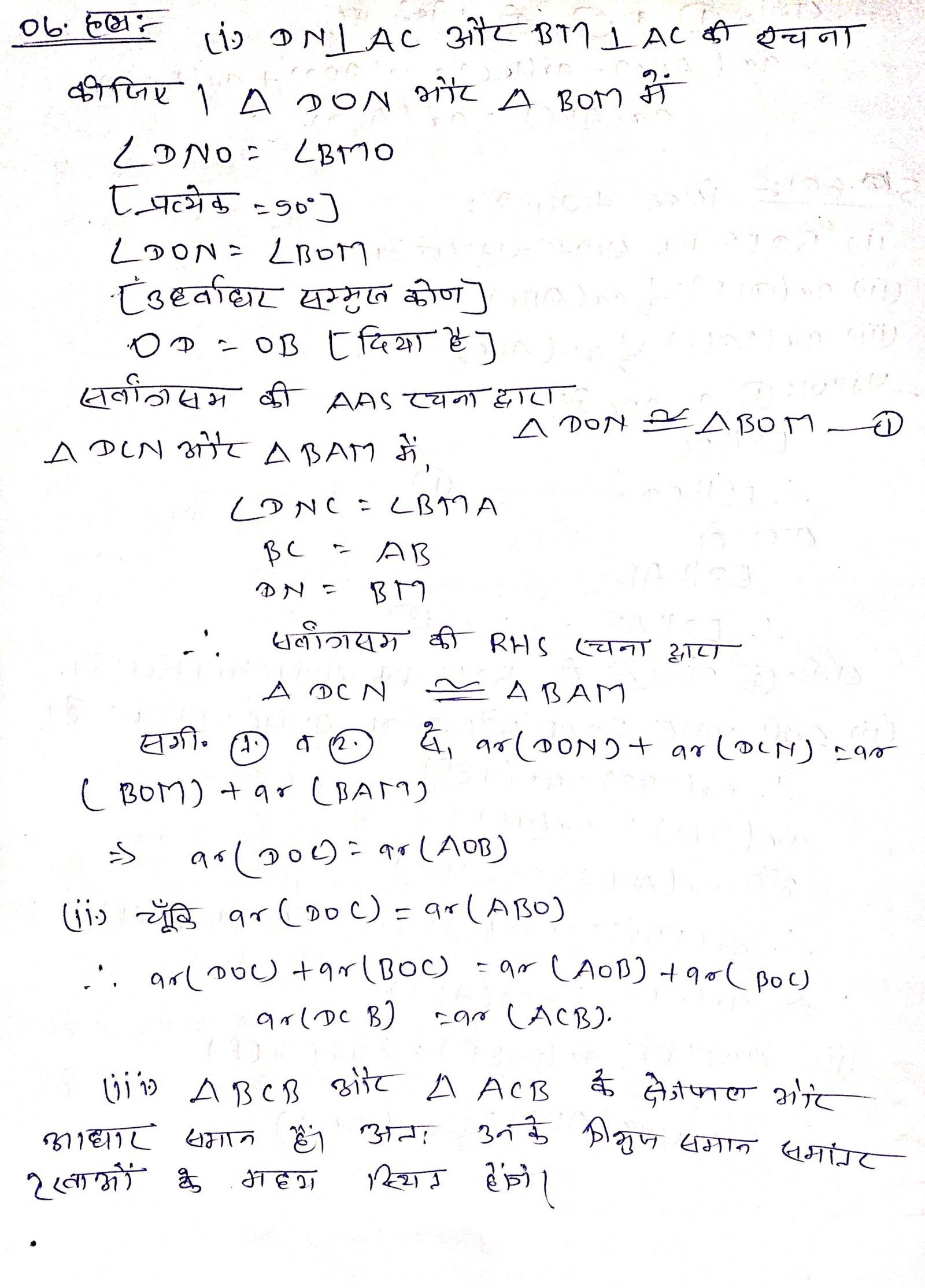 प्रश्न 15. चतुर्भुज ABCD के विकणं AC और BD परस्पर बिन्दु O पर इस प्रकार प्रतिच्छेद करते है कि ar (∆AOD) = ar (∆BOC) है। सिद्ध कीजिए कि ARCD एक समलम्य है।
