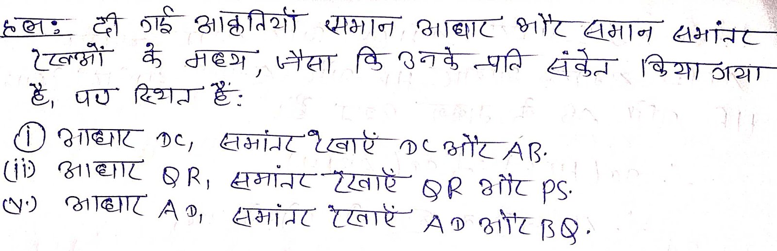 प्रश्न 1. पाठ्य पुस्तक में दी गई आकृतियों में कौन-सी आकृतियाँ एक ही आधार और एक ही समान्तर रेखाओं के बीच स्थित हैं? ऐसी स्थिति में,जभवनिष्ठ आधार और दोनों समान्तर रेखाएं लिखिए।
